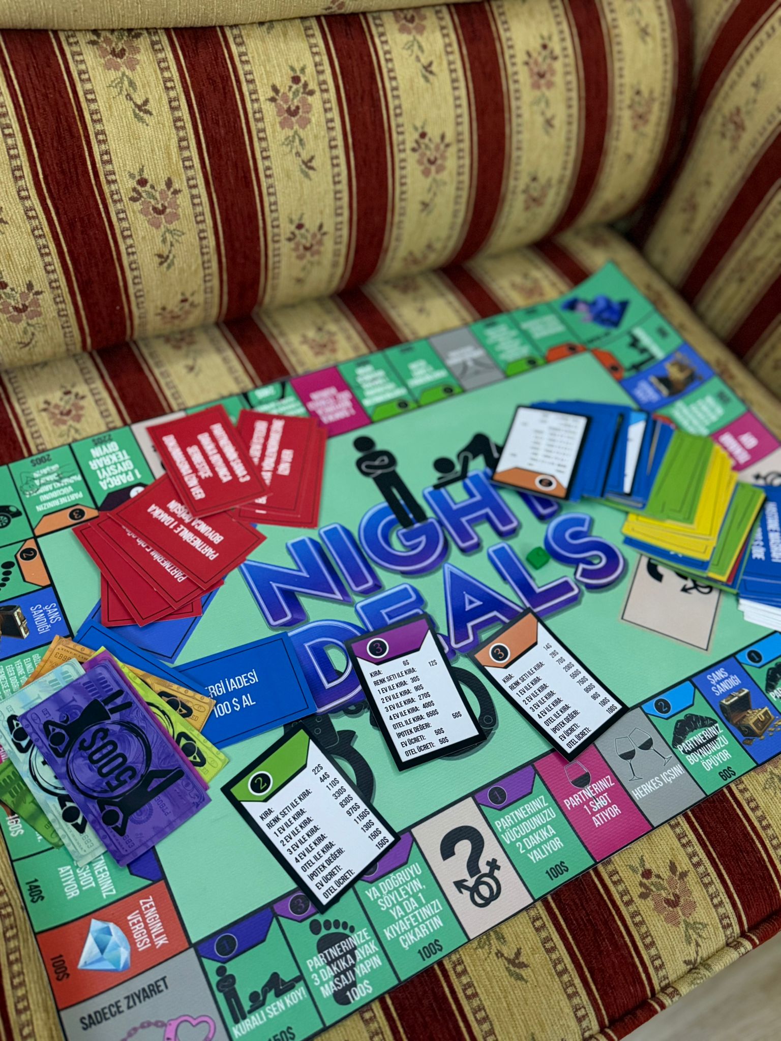 NightDeals; yetişkinlere özel, strateji, flört ve cesareti bir araya getiren eğlenceli bir kutu masa oyunudur. Her turda kart çekilir, görev yapılır, risk alınır ve bol bol gülünür.